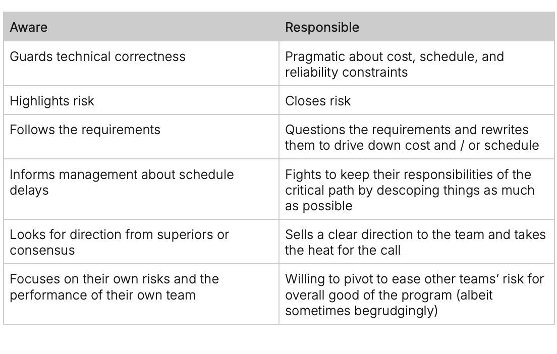 Take a more traditional aerospace organization example: A systems engineer might be responsible for establishing the requirements for a component, a domain specific engineer might be responsible for providing the overall design, a designer might responsible for the final CAD, an analyst responsible for providing margins, a scheduler might be responsible for the schedule, a program manager responsible for tracking costs and progress, a manufacturing engineer responsible for fabrication, and a test engineer responsible for validating the part. Maybe that’s a bit extreme, but I’m sure you have all seen similar scenarios. But who is accountable? “Responsibility” has been reduced to the narrow definition of “who completed the task”1. The why, how, and when something is done is delegated to others.